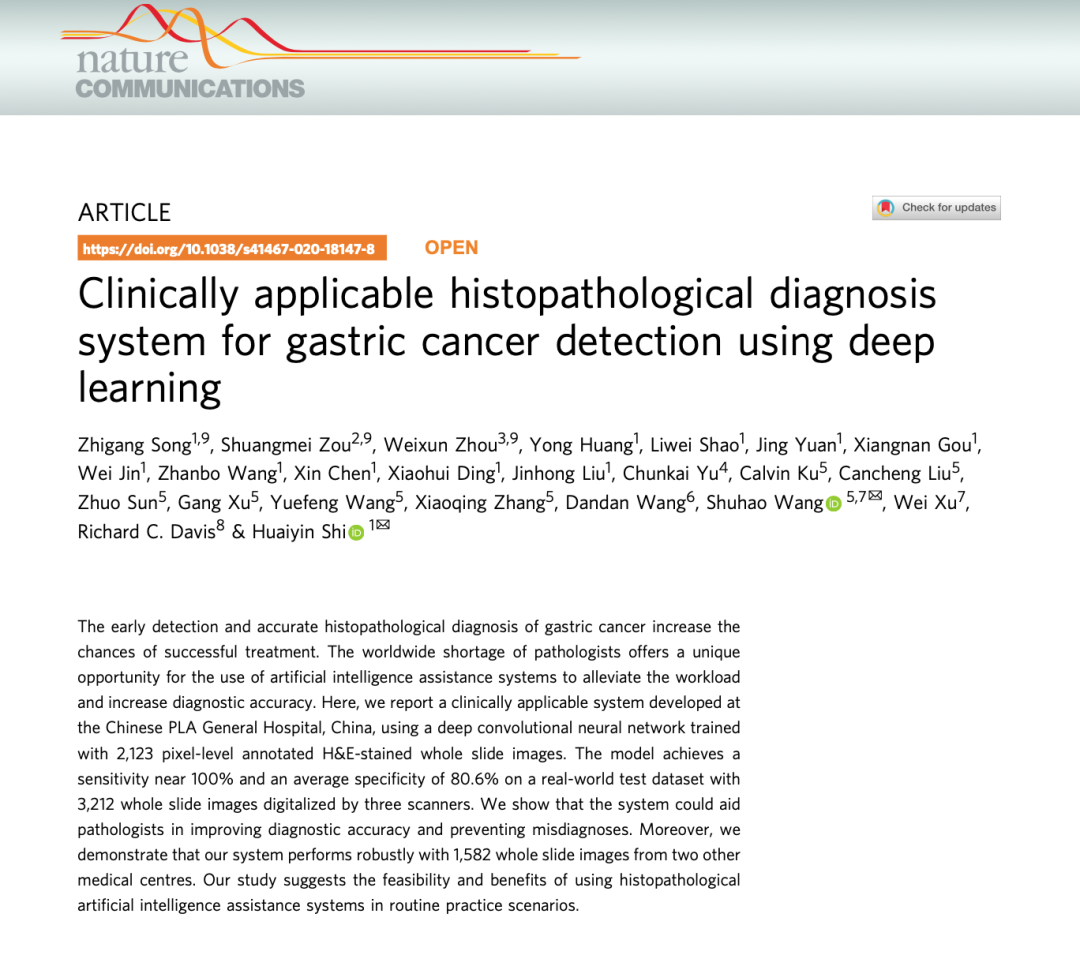 今年8月底,透徹影像聯(lián)合中國解放軍總醫(yī)院、中國醫(yī)學(xué)科學(xué)院腫瘤醫(yī)院和北京協(xié)和醫(yī)院開展的人工智能胃癌病理輔助診斷多中心研究成果「Clinicallyapplicable histopathological diagnosis system for gastriccancerdetection using deep learning」在NatureCommunications發(fā)表,這是中國研究團(tuán)隊在病理人工智能領(lǐng)域發(fā)表的頂級學(xué)術(shù)成果,也是全球首個可應(yīng)用于復(fù)雜器官臨床病理診斷的人工智能系統(tǒng)。這標(biāo)志著傳統(tǒng)病理走進(jìn)智慧病理新世代,將成為世界原創(chuàng)前沿技術(shù)成果的示范應(yīng)用,也是棲霞區(qū)打造人工智能產(chǎn)業(yè)地標(biāo)的重要成果。