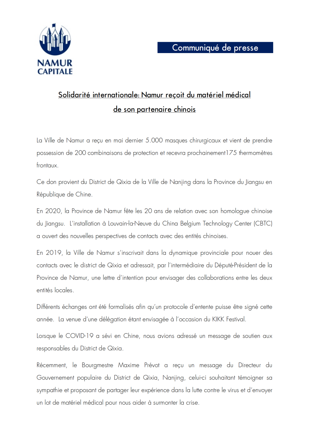 8月12日,比利時(shí)那慕爾省那慕爾市政府向棲霞發(fā)來(lái)感謝信,從棲霞高新區(qū)發(fā)出的棲霞區(qū)政府援助那慕爾省的最后一批防疫物資于近日輾轉(zhuǎn)抵達(dá)當(dāng)?shù)亍?/p>