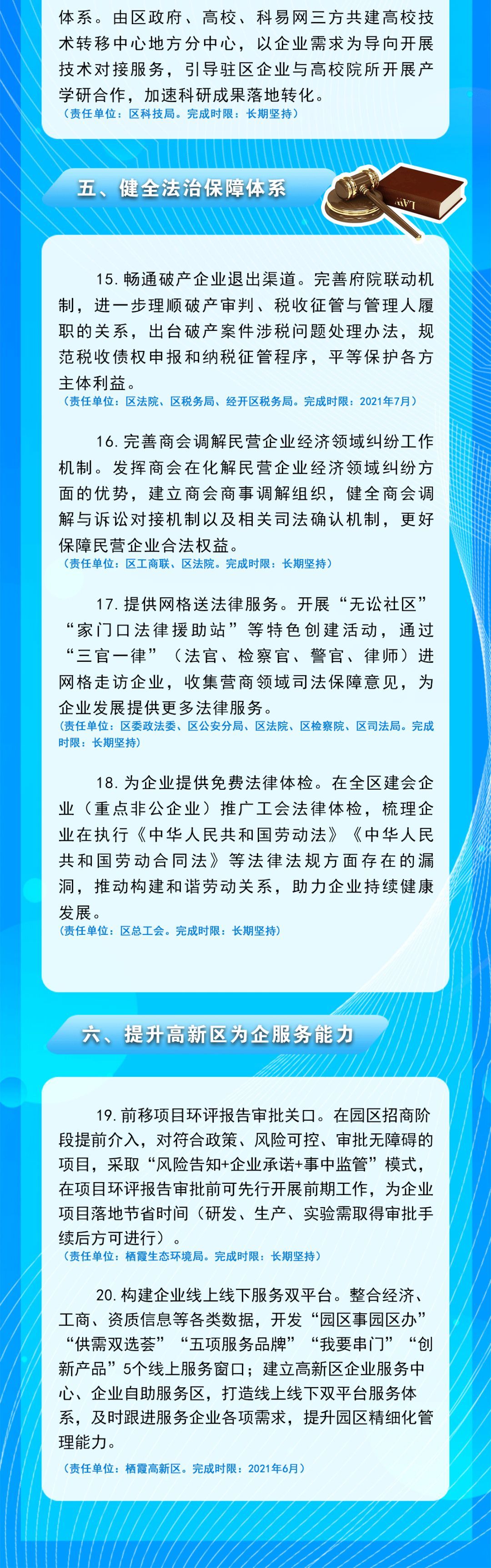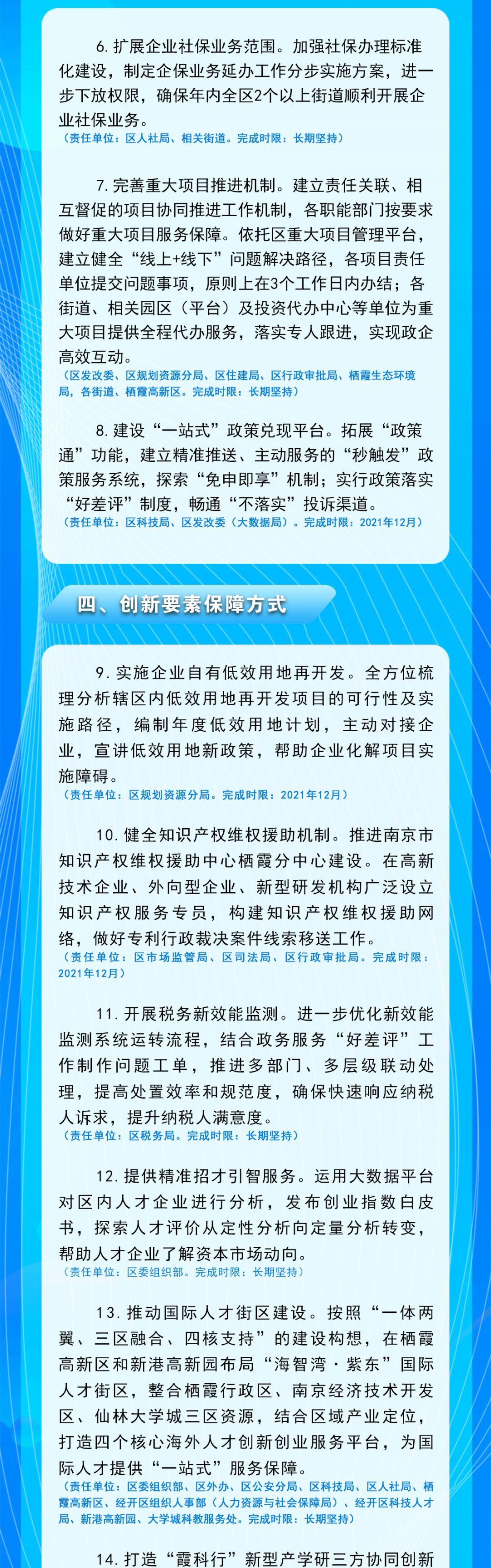 今年,棲霞區(qū)優(yōu)化營商環(huán)境政策編制聚焦政策延續(xù)性、棲霞特色優(yōu)勢、更高標(biāo)桿服務(wù),精準(zhǔn)推動創(chuàng)新再深入、改革再突破、政策再完善。注重深化去年政策的優(yōu)勢舉措,同時優(yōu)化調(diào)整實(shí)施效果欠佳的措施,不斷提升市場主體獲得感。著重考慮市場主體需求,充分發(fā)揮棲霞產(chǎn)業(yè)基礎(chǔ)發(fā)達(dá)、科教資源豐富、三區(qū)融合發(fā)展等區(qū)域優(yōu)勢特點(diǎn),為市場主體提供人才、科技、財(cái)稅等要素保障。全面總結(jié)營商環(huán)境改革經(jīng)驗(yàn)做法,在政策集成創(chuàng)新中突出先進(jìn)性,努力把棲霞打造成為全市范圍內(nèi)發(fā)展環(huán)境最優(yōu),投資吸引力、地區(qū)核心競爭力和軟實(shí)力最強(qiáng)的地區(qū)之一。