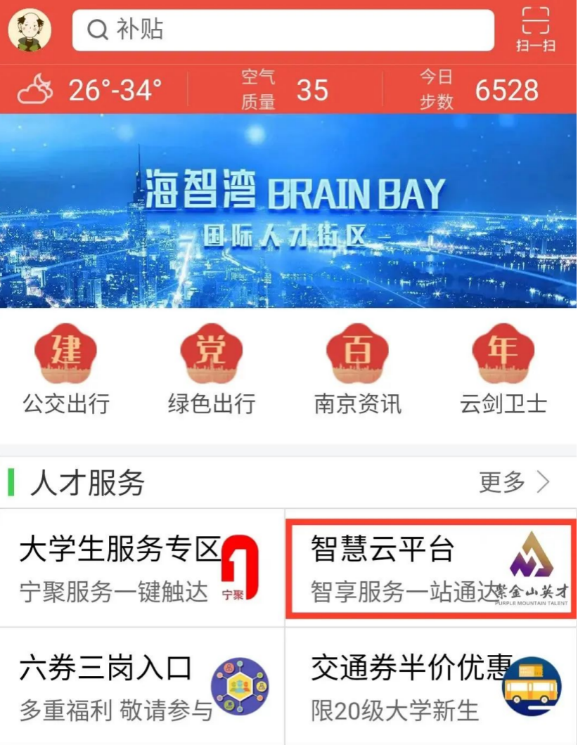 1、打開“我的南京”手機(jī)app,在“人才服務(wù)”板塊選擇“智慧云平臺”。