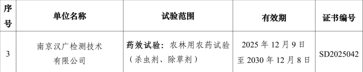 近日,從國(guó)家農(nóng)業(yè)農(nóng)村部傳來(lái)喜訊:南京漢廣檢測(cè)正式認(rèn)定為農(nóng)藥登記試驗(yàn)單位,實(shí)驗(yàn)范圍為藥效試驗(yàn):農(nóng)林用農(nóng)藥試驗(yàn)(殺蟲(chóng)劑、除草劑),證書(shū)編號(hào)SD2025042。