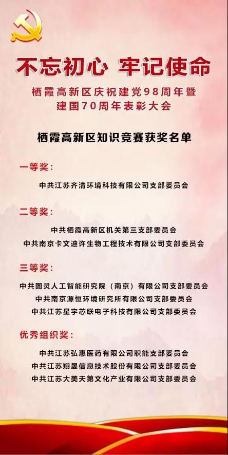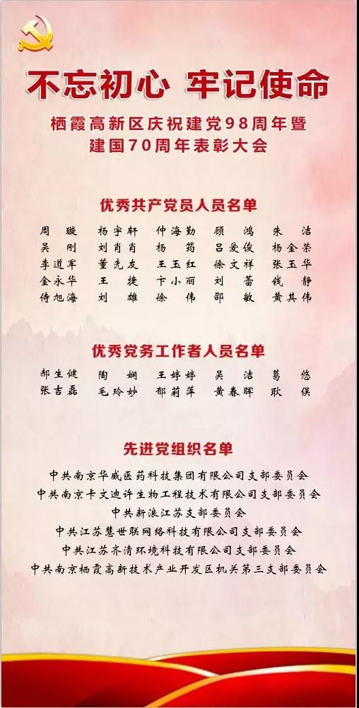 決定指出今年是中國共產(chǎn)黨成立98周年,是新中國成立 70 周年,也是決勝全面建成小康社會、實施“十三五”規(guī)劃的關(guān)鍵之年。為激勵各基層黨組織和廣大黨員堅定信念,立足崗位,履職盡責(zé),奮發(fā)有為,高新區(qū)工委決定對周璇等25名優(yōu)秀共產(chǎn)黨員、郝生健等10名優(yōu)秀黨務(wù)工作者、中共南京華威醫(yī)藥科技集團(tuán)有限公司支部委員會等6個先進(jìn)黨組織以及“學(xué)習(xí)強國”知識競賽獲獎黨組織予以表彰。