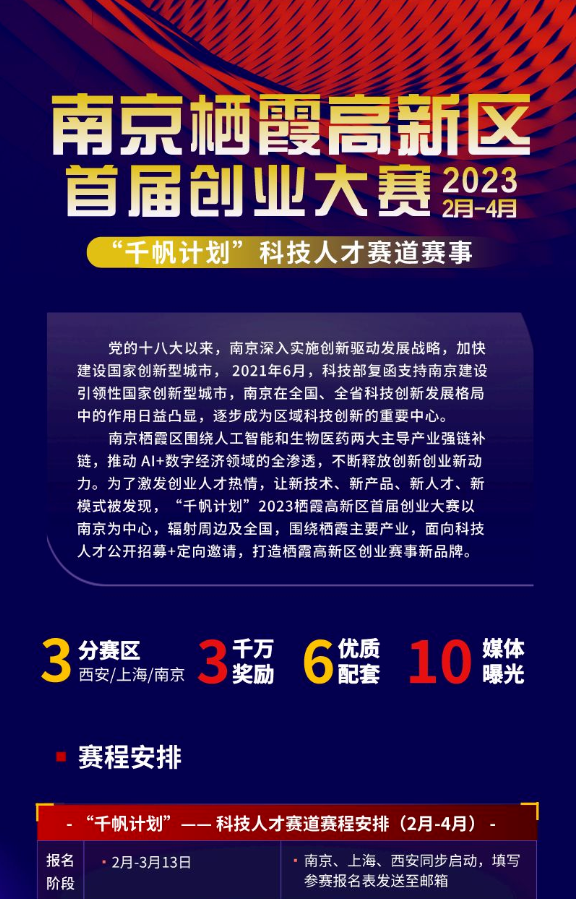 黨的十八大以來,南京深入實施創(chuàng)新驅動發(fā)展戰(zhàn)略,加快建設國家創(chuàng)新型城市,逐步成為區(qū)域科技創(chuàng)新的重要中心。南京棲霞區(qū)作為南京市新興產(chǎn)業(yè)發(fā)展的集聚區(qū),圍繞人工智能與數(shù)字經(jīng)濟、新醫(yī)藥與生命健康兩大主導產(chǎn)業(yè)強鏈補鏈,推動 AI+數(shù)字經(jīng)濟領域的全滲透。為了激發(fā)創(chuàng)業(yè)人才熱情,挖掘優(yōu)質(zhì)人才和項目,讓新技術、新產(chǎn)品、新人才、新業(yè)態(tài)被發(fā)現(xiàn),2023年南京棲霞高新區(qū)首屆創(chuàng)業(yè)大賽“千帆計劃”科技人才賽道賽事正式啟動!