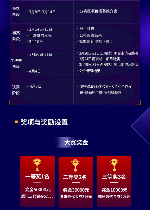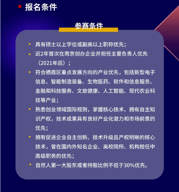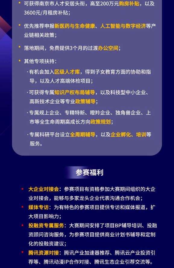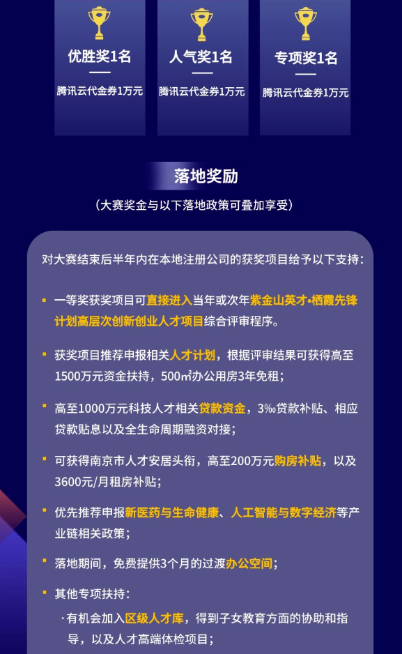 君子學以聚之,匯學識,攬人才,共赴科技創(chuàng)業(yè)大道。首屆大賽由中共南京市棲霞區(qū)委人才工作領導小組辦公室聯(lián)合南京棲霞高新技術產(chǎn)業(yè)開發(fā)區(qū)主辦,以南京為中心,設置上海、西安分賽區(qū),輻射全國。將歷時4個月,涉及人工智能+、智能制造、互聯(lián)網(wǎng)+、生物醫(yī)藥等多個領域,為參賽項目提供一個展示、輔導、大企業(yè)對接、投資、媒體曝光等一系列專屬服務的機會。大賽共計近30萬獎金、10萬元騰訊云代金券、1500萬人才獎勵支持、200萬購房補貼、1000萬科技人才貸款資金等,除此之外,參賽即可獲得貫穿大賽全程的賦能培訓沙龍,獲得與多家龍頭企業(yè)溝通合作機會,與投融資機構深度接觸,騰訊資源對接,以及為有特色的參賽項目提供媒體報道最強曝光等等,共同挖掘助力具有創(chuàng)新性、前沿性和突破性的科創(chuàng)項目茁壯成長。