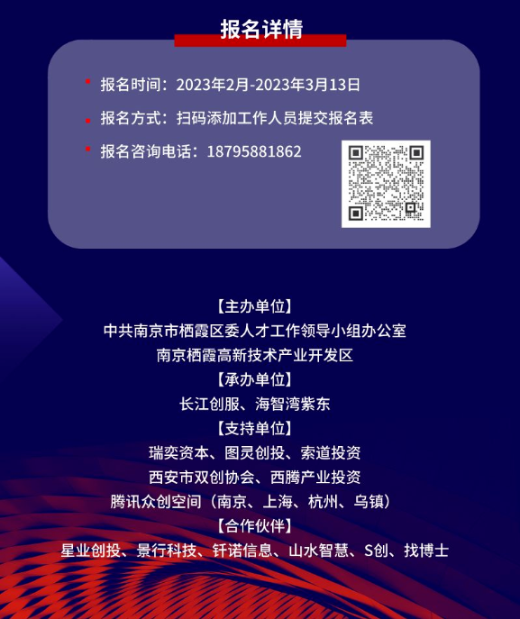 滿懷信心,共創(chuàng)未來,棲霞高新區(qū)首屆創(chuàng)業(yè)大賽蓄勢待發(fā),半決賽上海站、南京站、西安站將于2023年3月21日、3月24日與3月30日陸續(xù)開啟,期待能夠與更多來自海內(nèi)外的創(chuàng)業(yè)者結伴同行,匯集全球智慧,共同揚帆起航!
