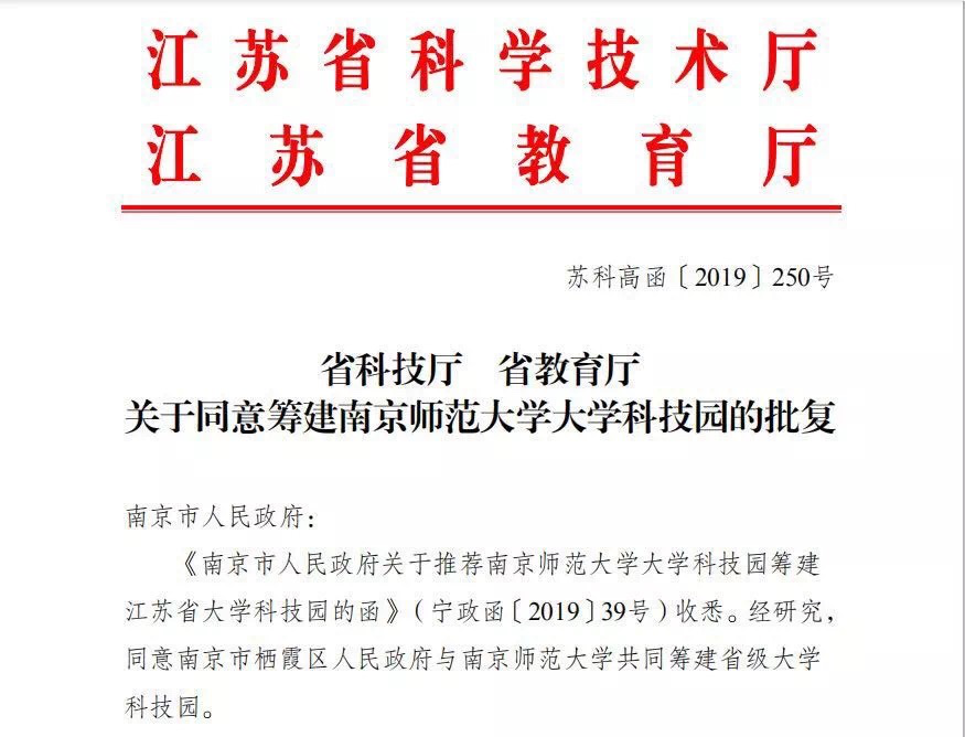 2018年1月,棲霞區(qū)政府與南京師范大學共同簽訂“南京師范大學科技園棲霞園區(qū)”合作協(xié)議,在棲霞區(qū)政府大力支持下,同年4月科技園正式入駐辦公。作為棲霞高新區(qū)的“園中園”,棲霞高新區(qū)竭誠為科技園提供項目落戶流程、人才對接、政策推介等方面服務(wù)。通過1年的開拓與發(fā)展,2019年6月26日,科技園順利取得省科技廳、省教育廳同意其籌建省級大學科技園的批復(fù)函。同年9月,省級大學科技園成功揭牌。