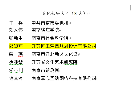 其中科技創(chuàng)新拔尖人才組1人梁露露(南京源堡科技研究院有限公司)、文化拔尖人才組棲霞區(qū)唯一1人邵穎萍(江蘇匠工營國規(guī)劃設(shè)計有限公司)。