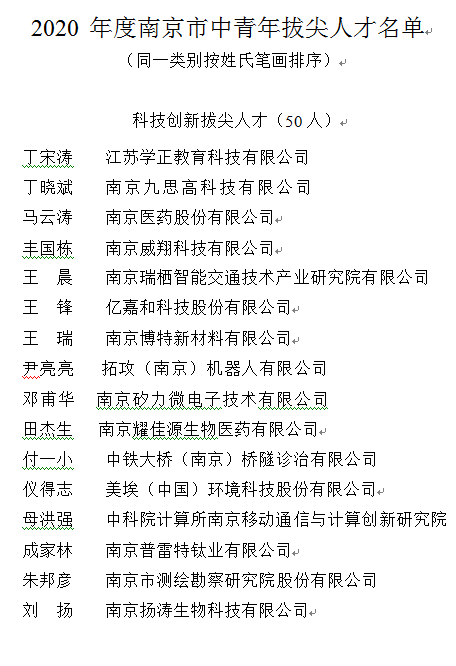 根據(jù)《南京市關(guān)于中青年拔尖人才選拔培養(yǎng)的實施辦法(修訂)》(寧委辦發(fā)〔2020〕1號)等文件規(guī)定,經(jīng)評審,現(xiàn)確定2020年度南京市中青年拔尖人才111人。棲霞區(qū)確定入選南京市中青年拔尖人才10人,其中高新區(qū)2人。