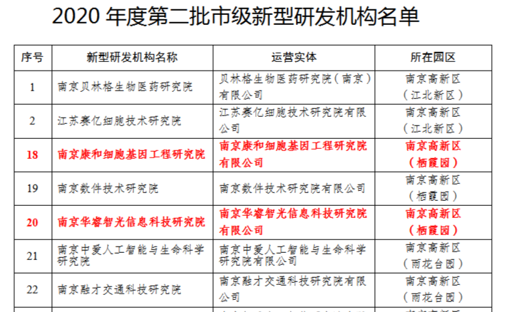 1月12日,“2020年度第二批市級(jí)新型研發(fā)機(jī)構(gòu)名單”正式公布,棲霞高新區(qū)新型研發(fā)機(jī)構(gòu)南京康和細(xì)胞基因工程研究院和南京華睿智光信息科技研究院成功入選。