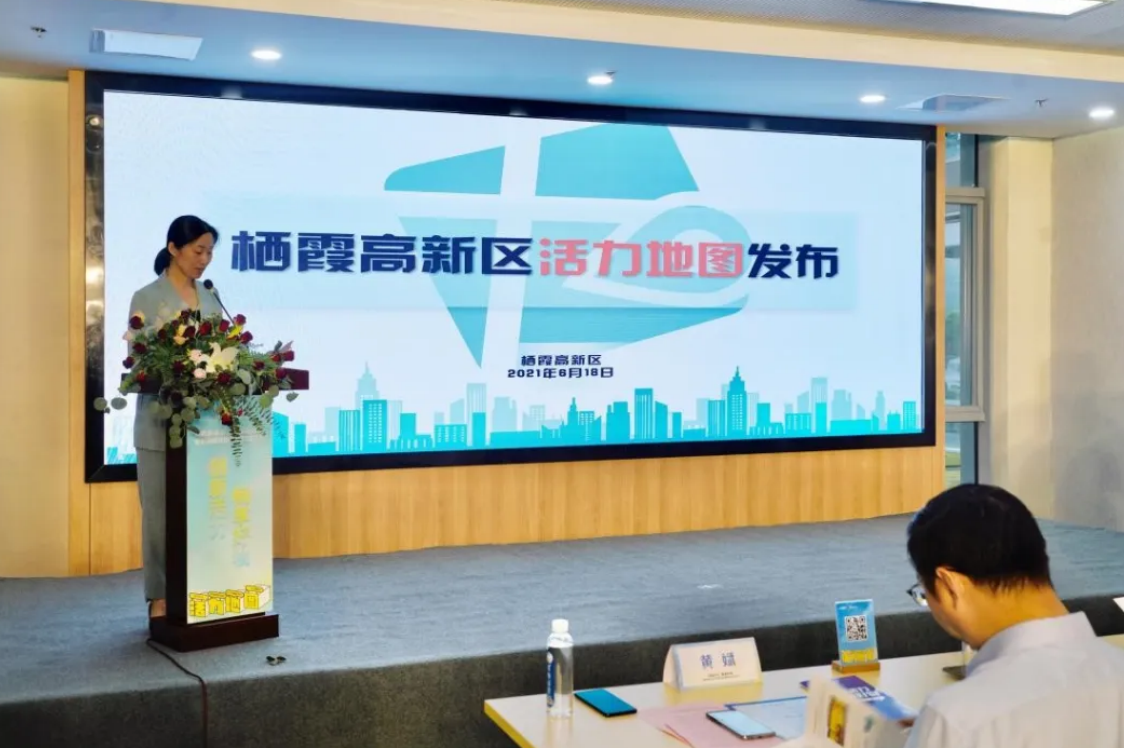 活動現(xiàn)場,南京市企服中心主任丁波,棲霞區(qū)政府副區(qū)長盧靜、副區(qū)長王靖華共同啟動棲霞高新區(qū)“活力地圖”。