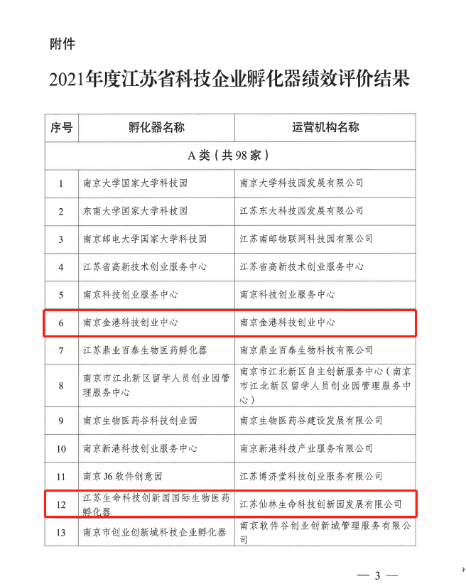 根據(jù)江蘇省科技廳公布的2021年度江蘇省科技企業(yè)孵化器績效評(píng)價(jià)結(jié)果,棲霞高新區(qū)自有三家國家級(jí)科技企業(yè)孵化器南京金港科技創(chuàng)業(yè)中心、江蘇生命科技創(chuàng)新園國際生物醫(yī)藥孵化器和南京紫東國際企業(yè)孵化器在省級(jí)績效評(píng)價(jià)全部獲評(píng)優(yōu)秀(A類)。